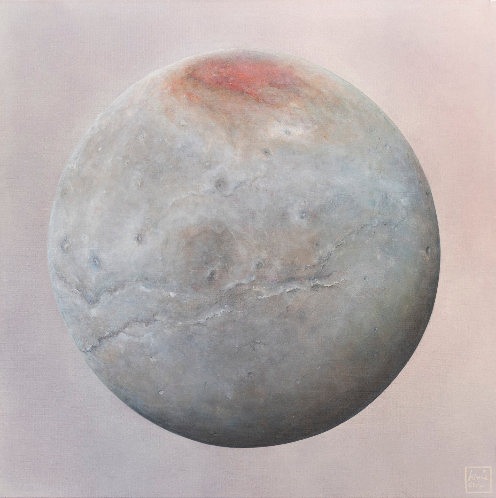 Charon is de grootste maan van Pluto en bijna de helft van zijn grootte. Samen draaien ze om een punt tussen hen in, waardoor ze worden gezien als een bijna-dubbelplaneet. Het oppervlak van Charon bestaat uit ijs en gesteente, met sporen van oude kloven en bevroren vlaktes. In tegenstelling tot Pluto is Charon grijzer van kleur, door het ontbreken van methaanijs aan het oppervlak. Dit schilderij is geïnspireerd op een infraroodopname van NASA-missie New Horizons.