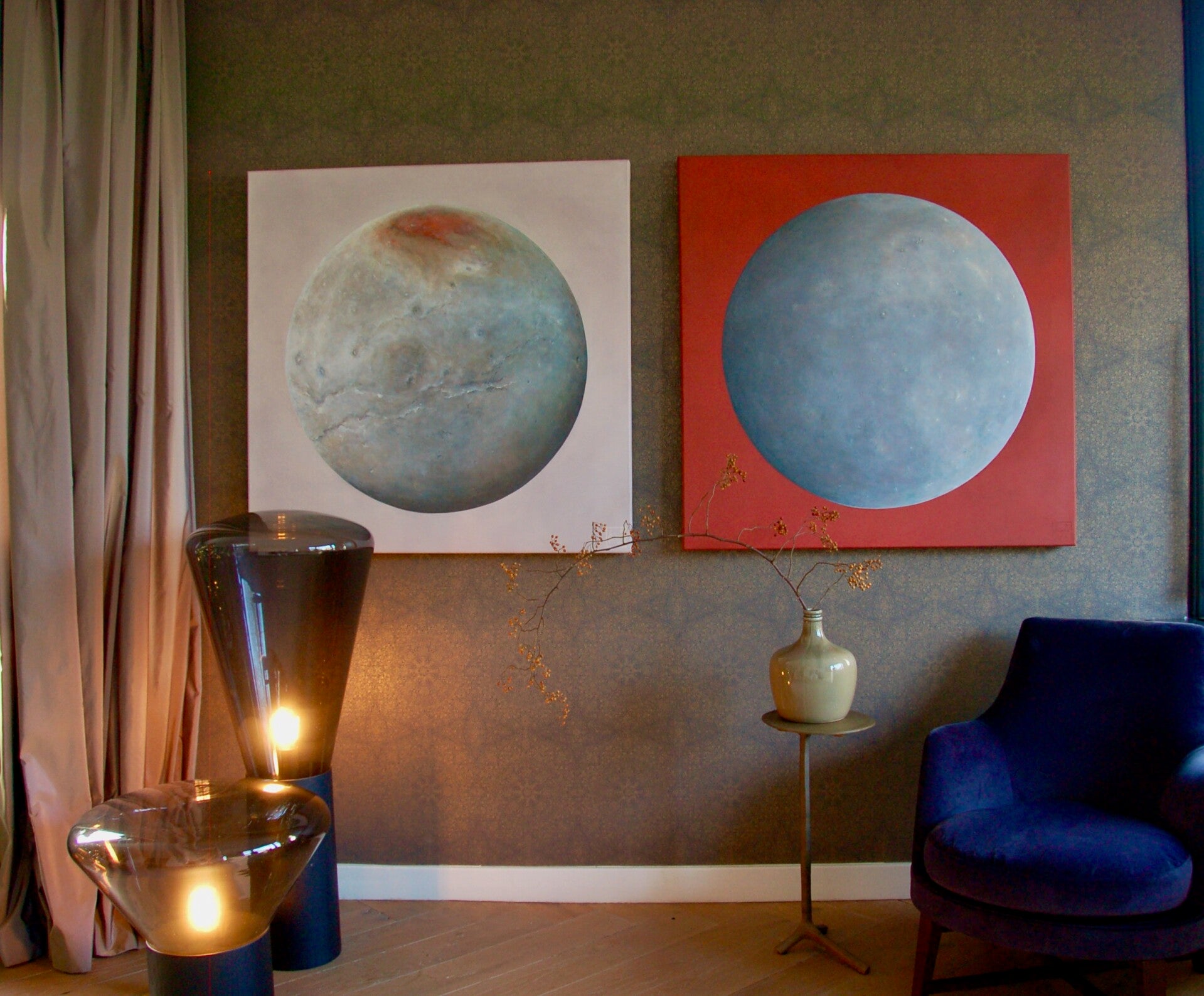 Charon is de grootste maan van Pluto en bijna de helft van zijn grootte. Samen draaien ze om een punt tussen hen in, waardoor ze worden gezien als een bijna-dubbelplaneet. Het oppervlak van Charon bestaat uit ijs en gesteente, met sporen van oude kloven en bevroren vlaktes. In tegenstelling tot Pluto is Charon grijzer van kleur, door het ontbreken van methaanijs aan het oppervlak. Mijn schilderij is geïnspireerd op een infraroodopname van NASA-missie New Horizons.
